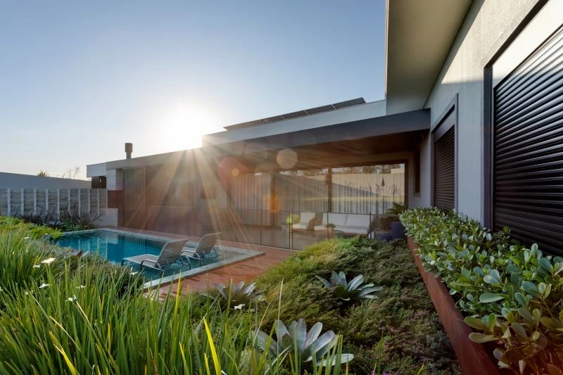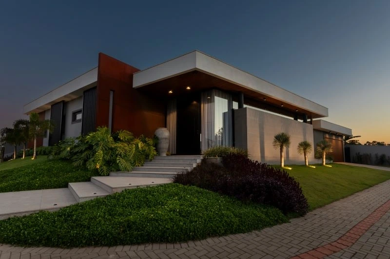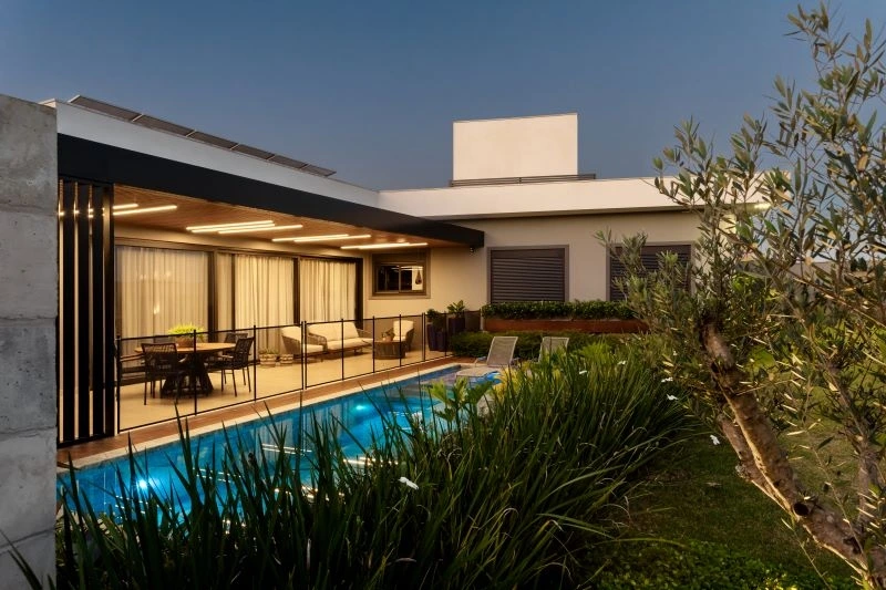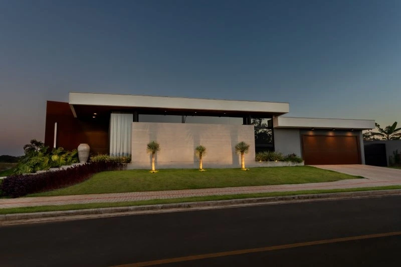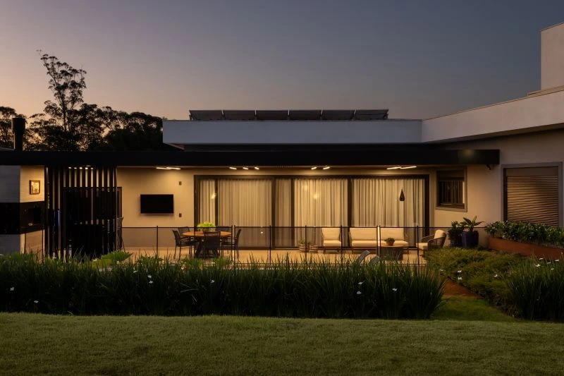 - Características adicionais: Aberturas em PVC com persianas automatizadas, forro ripado Garapeira, aquecimento solar, concreto aparente, aço Corten, energia fotovoltaica