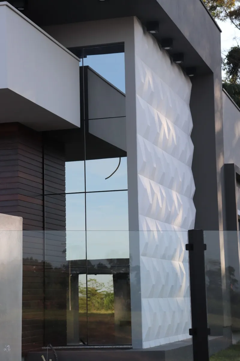 - Características adicionais: Aberturas e ripado Itaúba, painel Glazing frontal, fachada com elemento 3D, muros em alumínio e vidro, jardinagem